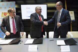 Podpisanie "Partnerstwa na rzecz zrównoważonego rozwoju” pomiędzy EDF Polska S.A., a miastem Gdańsk. Europejskie Centrum Solidarności w Gdańsku. Nz. od lewej: Prezes EDF Polska S.A. Thierry Doucerain, Przewodniczący Rady Nadzorczej EDF Polska S.A. Gerard Roth i Prezydent Gdańska Paweł Adamowicz
