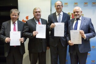 Podpisanie "Partnerstwa na rzecz zrównoważonego rozwoju” pomiędzy EDF Polska S.A., a miastem Gdańsk. Europejskie Centrum Solidarności w Gdańsku. Nz. od lewej: Prezes EDF Polska S.A. Thierry Doucerain, Przewodniczący Rady Nadzorczej EDF Polska S.A. Gerard Roth, Prezydent Gdańska Paweł Adamowicz, Dyrektor Oddziału Wybrzeże EDF Polska S.A. Henryk Dworakowski