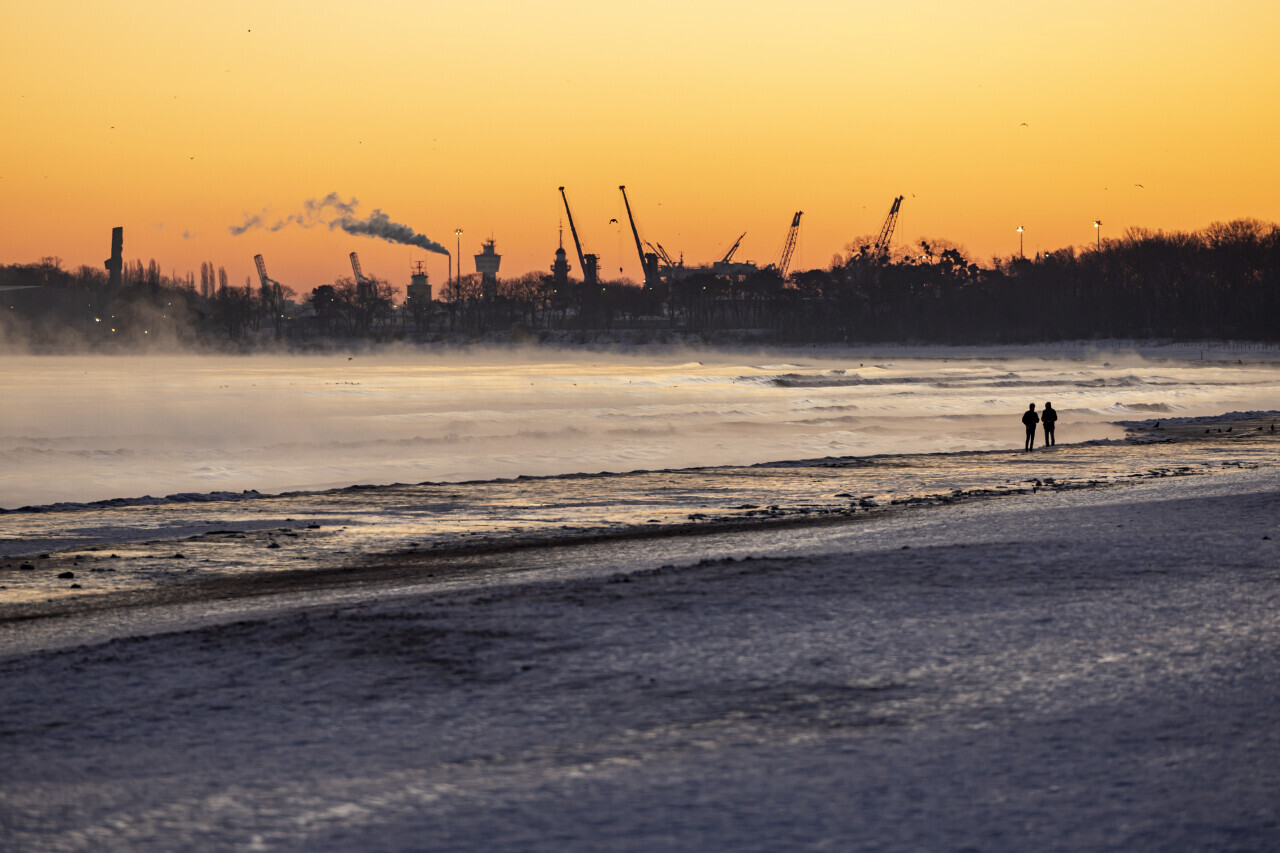 Gdańsk. Duża różnica temperatury pomiędzy powietrzem a morzem powoduje, że woda zaczyna parować. Wcześnie rano wschodzące słońce oświtela parę tworząc niesamowite efekty