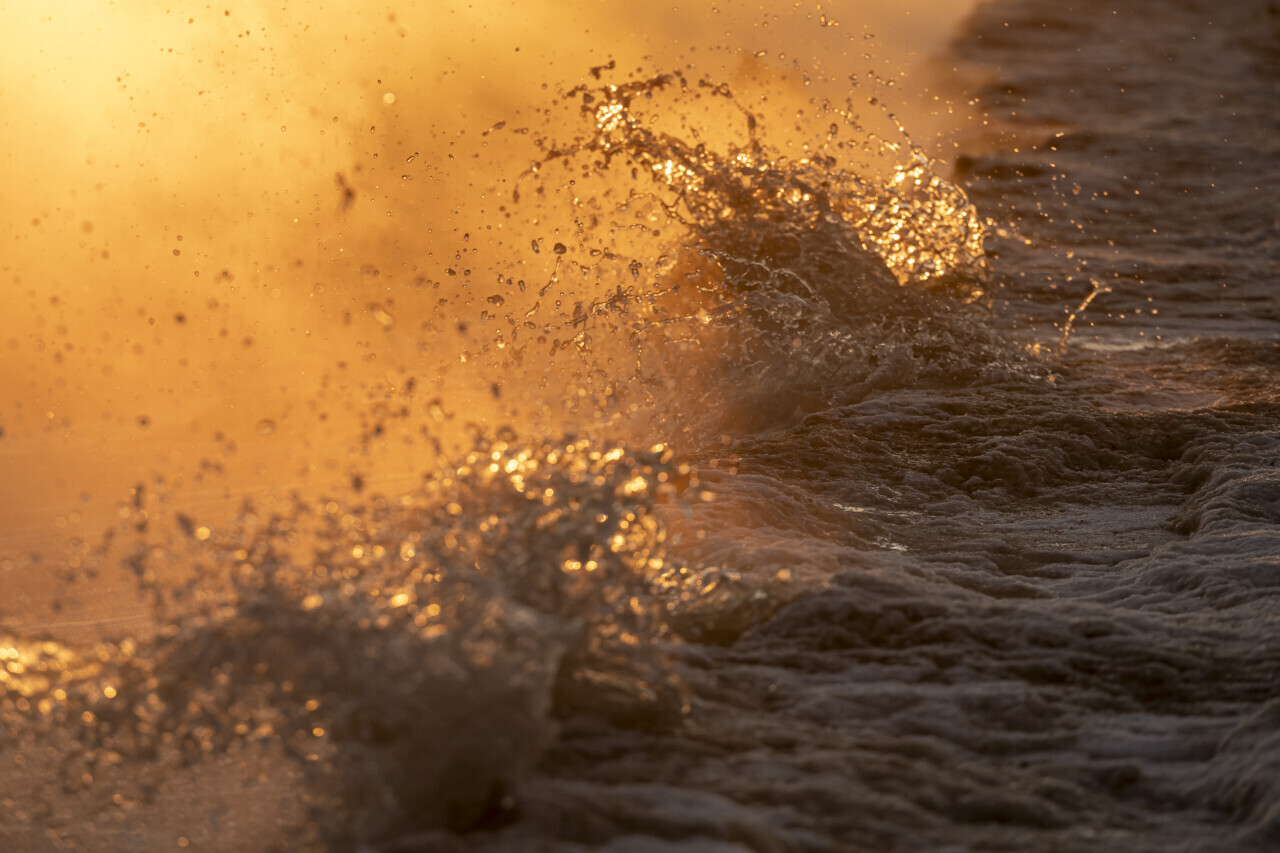 Gdańsk. Duża różnica temperatury pomiędzy powietrzem a morzem powoduje, że woda zaczyna parować. Wcześnie rano wschodzące słońce oświtela parę tworząc niesamowite efekty