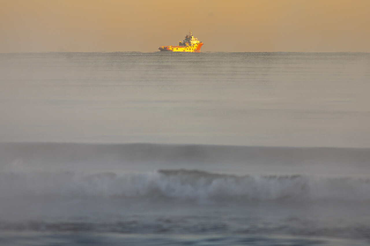 Gdańsk. Duża różnica temperatury pomiędzy powietrzem a morzem powoduje, że woda zaczyna parować. Wcześnie rano wschodzące słońce oświtela parę tworząc niesamowite efekty