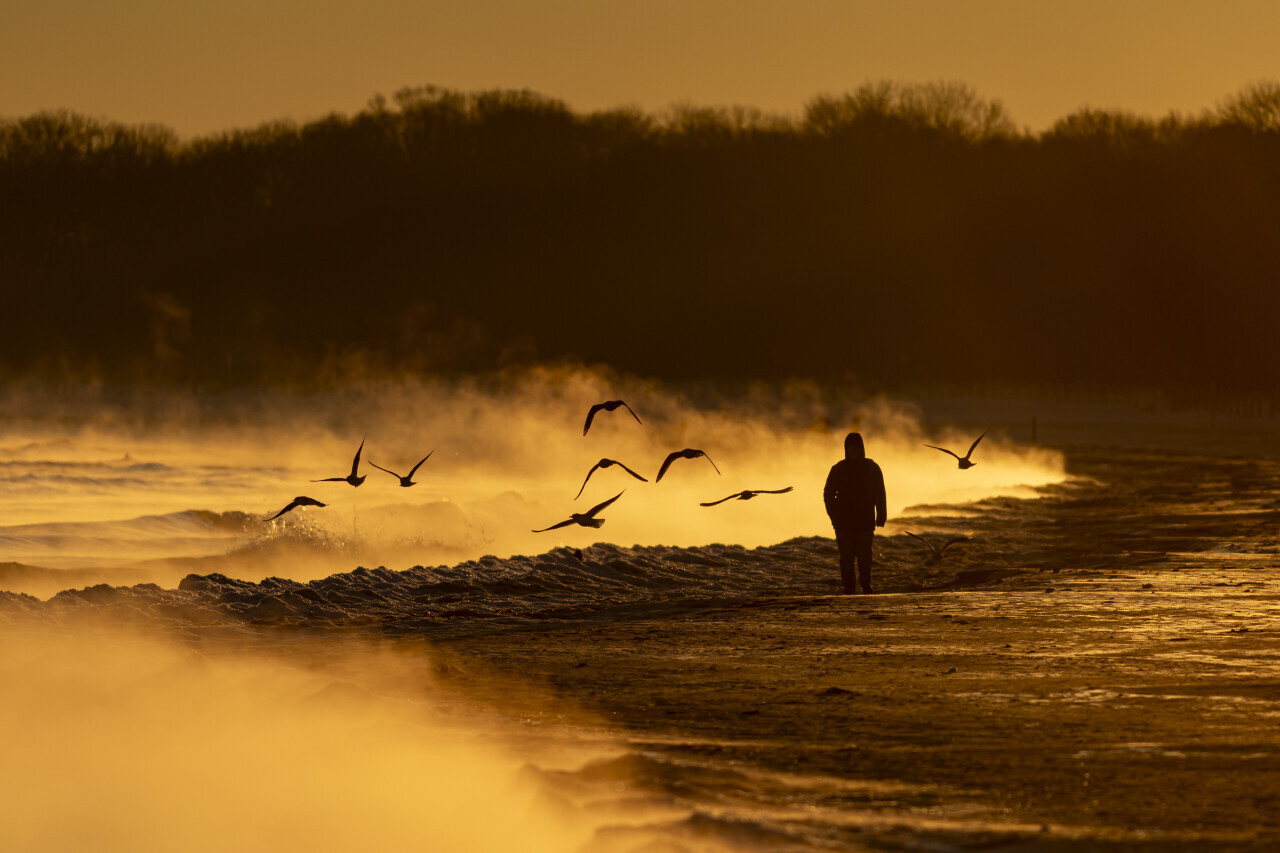 Gdańsk. Duża różnica temperatury pomiędzy powietrzem a morzem powoduje, że woda zaczyna parować. Wcześnie rano wschodzące słońce oświtela parę tworząc niesamowite efekty