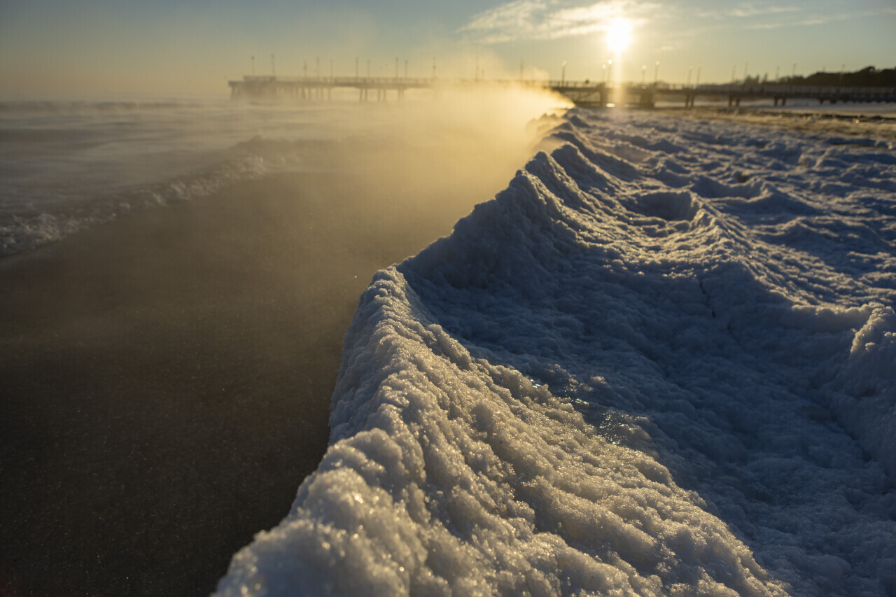 Parujące morze na plaży w Brzeźnie