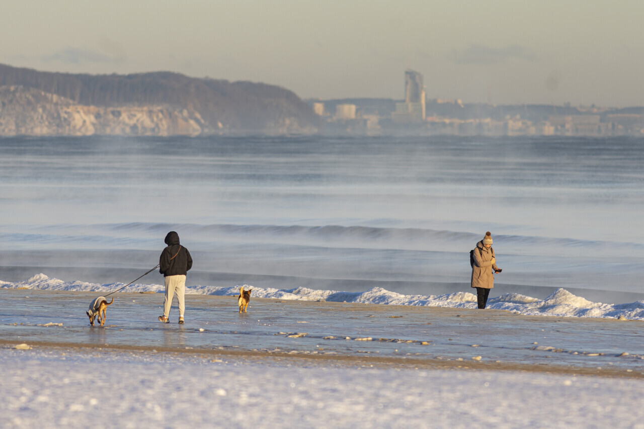 Gdańsk. Duża różnica temperatury pomiędzy powietrzem a morzem powoduje, że woda zaczyna parować. Wcześnie rano wschodzące słońce oświtela parę tworząc niesamowite efekty