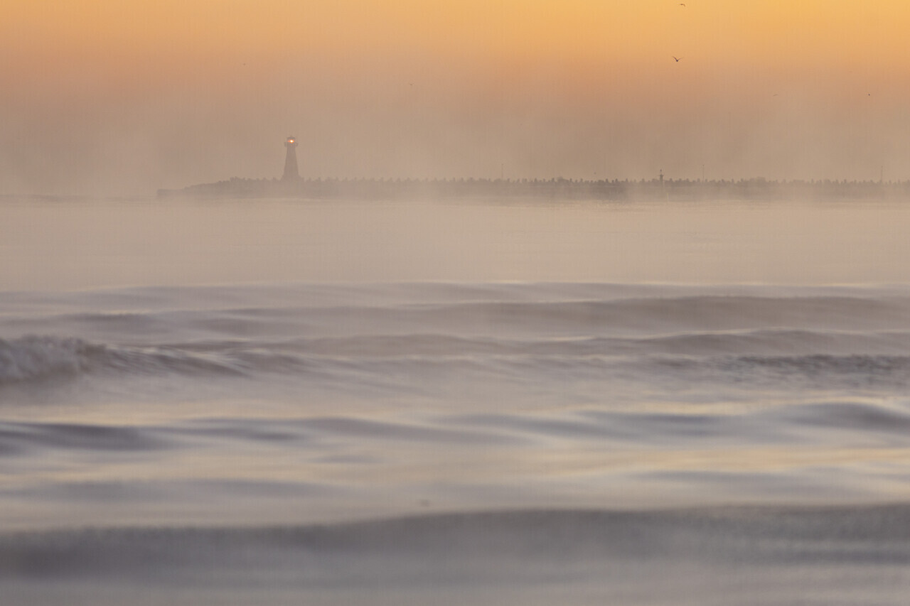 Gdańsk. Duża różnica temperatury pomiędzy powietrzem a morzem powoduje, że woda zaczyna parować. Wcześnie rano wschodzące słońce oświtela parę tworząc niesamowite efekty
