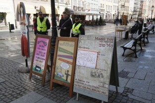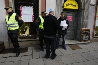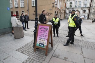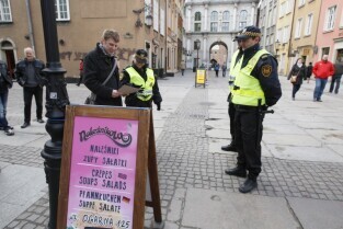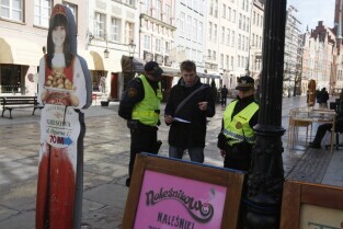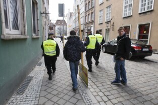 Gdańsk, Główne Miasto. Patrol kontrolujący legalność reklam w pasie drogowym (tzw. koziołków), w którym udział wzięli funkcjonariusze Straży Miejskiej i Kierownik Referatu Estetyzacji Miasta UMG Michał Szymański.