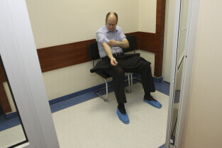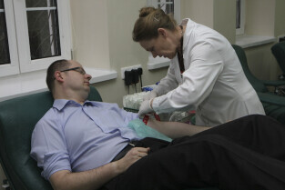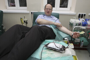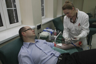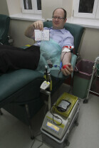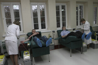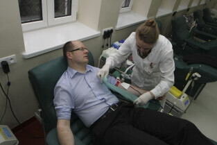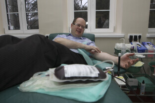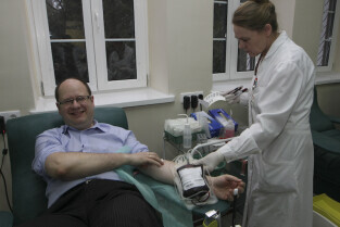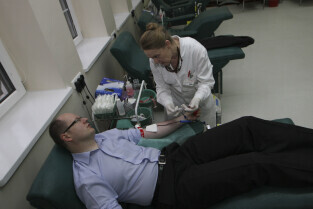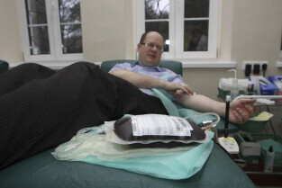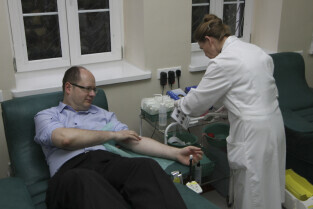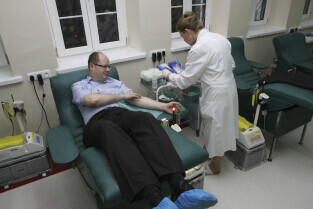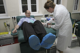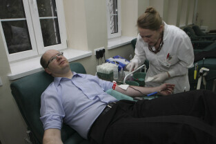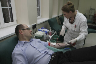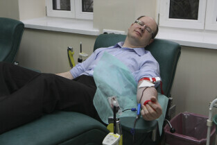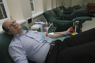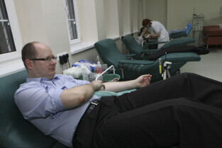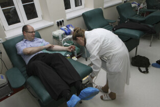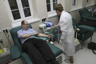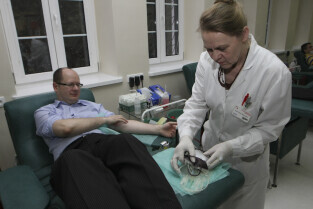 Prezydent Gdańska Paweł Adamowicz oddaje krew. Gdańsk, Centrum Krwiodawstwa i Krwiolecznictwa