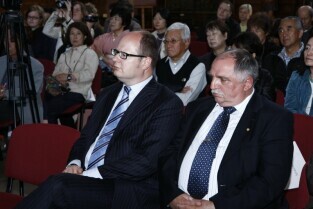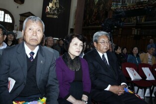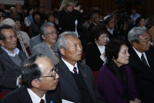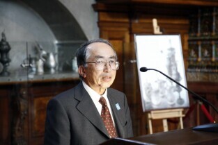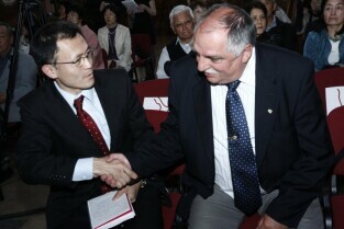 Gdańsk gościł grupę Japończyków zrzeszonych w organizacji Peace Boat (Statek Pokoju). Nz. Świadek wybuchów atomowych w miastach Japońskich Pan Takayoshi Kajiyama, po prawej Prezydent Gdańska Paweł Adamowicz