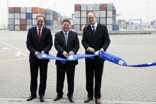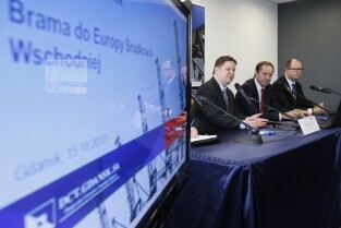 Konferencja prasowa z okazji piątych urodzin terminala kontenerowego DCT połączona z otwarciem dodatkowej powierzchni składowej. Gdańsk Stogi. Nz. od lewej: Marszałek Woj. Pomorskiego Mieczysław Struk, Dyrektor Zarządzający DCT Gdańsk Boris Wenzel, Prezydent Gdańska Paweł Adamowicz