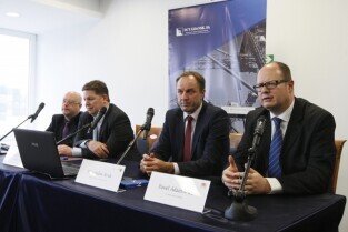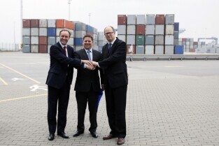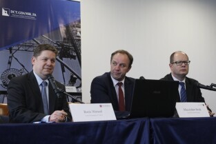 Konferencja prasowa z okazji piątych urodzin terminala kontenerowego DCT połączona z otwarciem dodatkowej powierzchni składowej. Gdańsk Stogi. Nz. lewej: Dyrektor Zarządzający DCT Gdańsk Boris Wenzel, Marszałek Woj. Pomorskiego Mieczysław Struk, Prezydent Gdańska Paweł Adamowicz