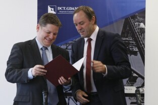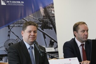 Konferencja prasowa z okazji piątych urodzin terminala kontenerowego DCT połączona z otwarciem dodatkowej powierzchni składowej. Gdańsk Stogi. Nz. Dyrektor Zarządzający DCT Gdańsk Boris Wenzel, po prawej Marszałek Woj. Pomorskiego Mieczysław Struk