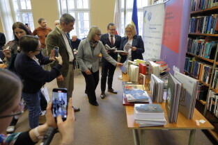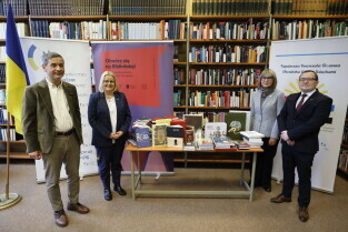 Gdańsk, WMBP. Pierwsza Dama Ukrainy Ołena Zełenska podarowała książki polskim bibliotekom. W uroczystości wzięli udział Jarosław Zalesiński-Dyrektor Biblioteki Wojewódzkiej w Gdańsku, Oleksandr Plodystyi-Konsul Ukrainy w Gdańsku, Agnieszka Baranowska-Dyrektor Kancelarii Marszałka Województwa Pomorskiego i prof. dr hab. Irina Matiash.