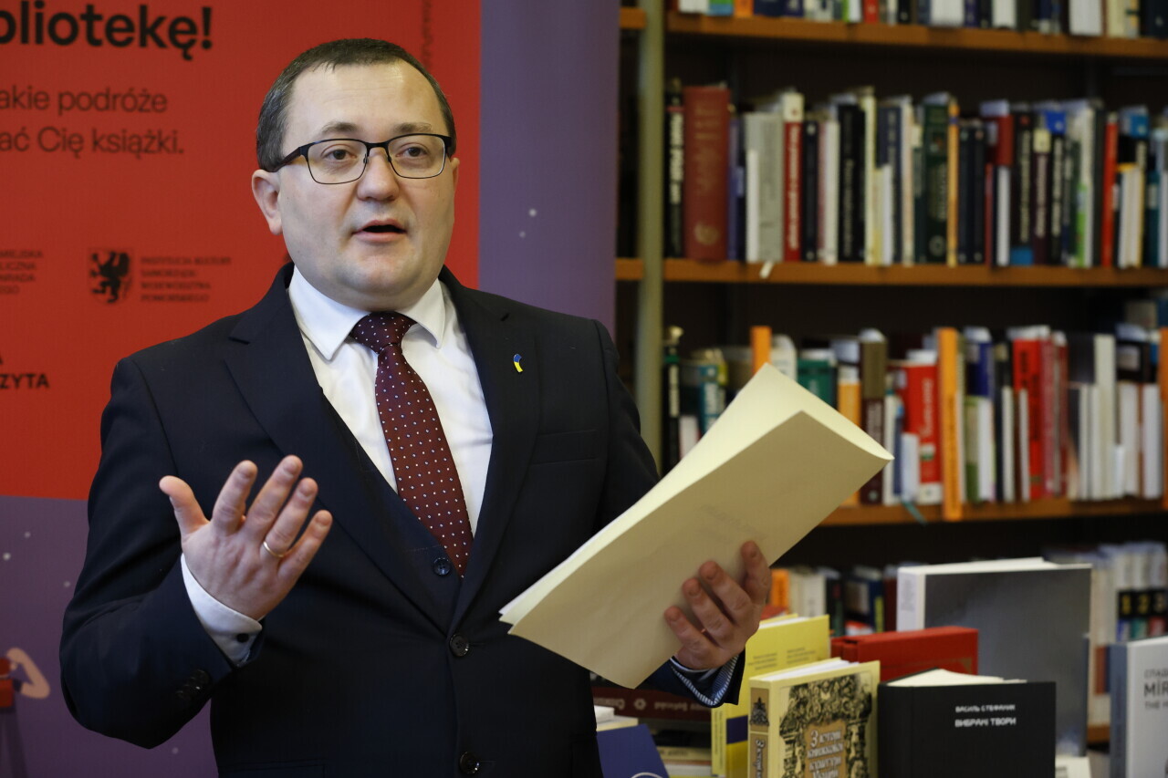 Gdańsk, WMBP. Pierwsza Dama Ukrainy Ołena Zełenska podarowała książki polskim bibliotekom. W uroczystości wzięli udział Jarosław Zalesiński-Dyrektor Biblioteki Wojewódzkiej w Gdańsku, Oleksandr Plodystyi-Konsul Ukrainy w Gdańsku, Agnieszka Baranowska-Dyrektor Kancelarii Marszałka Województwa Pomorskiego i prof. dr hab. Irina Matiash.