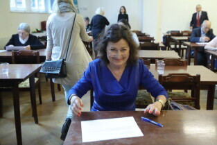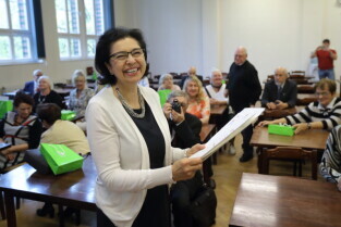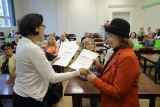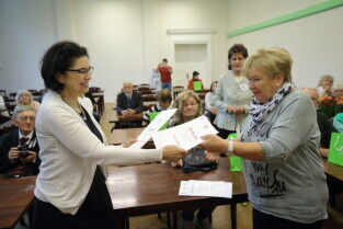 Gdańsk. I Ogólnopolska Olimpiada Wiedzy Obywatelskiej "Senior Obywatel" Pierwsze Gdańskie Eliminacje o Puchar Prezydenta Gdańska. Nz. Posłanka Małgorzata Chmiel podczas wręczania dyplomów.