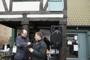 Gdańsk Orunia, ul. Gościnna. Wbicie pierwszej łopaty pod rozbudowę Centrum Innowacji i Aktywizacji Społecznej, w ramach której powstanie budynek edukacyjno-wystawienniczy z kuźnią. Nz. Prezydent Gdańska Paweł Adamowicz i Prezes Stowarzyszenia Inicjatyw Lokalnych Piotr Wróblewski