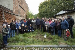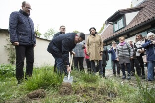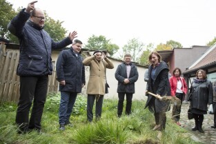 Gdańsk Orunia, ul. Gościnna. Wbicie pierwszej łopaty pod rozbudowę Centrum Innowacji i Aktywizacji Społecznej, w ramach której powstanie budynek edukacyjno-wystawienniczy z kuźnią. Nz. od lewej: Prezydent Gdańska Paweł Adamowicz, Podsekretarz Stanu w Ministerstwie Rozwoju Regionalnego Paweł Orłowski, Radna Miasta Gdańska Małgorzata Chmiel, Prezes Stowarzyszenia Inicjatyw Lokalnych Piotr Wróblewski, Marianna Sitek-Wróblewska (Gdańska Fundacja Innowacji Społecznej)