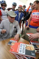 Gdańsk. Pierwszy Maraton Sierpniowy, czyli wyścig rolkarzy ulicami Gdańska. Nz. Lech Wałęsa podpisuje książkę "Moja III RP"