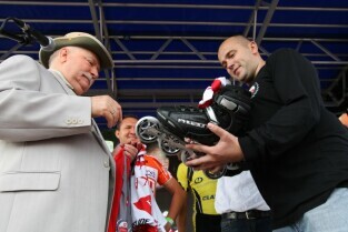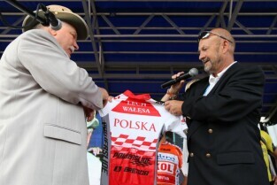 Gdańsk. Pierwszy Maraton Sierpniowy, czyli wyścig rolkarzy ulicami Gdańska. Nz. Prezes Polskiego Związku Sportów Wrotkarskich Jerzy Pisarek przekazuje Lechowi Wałęsie pamiątkową koszulkę