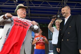 Gdańsk. Pierwszy Maraton Sierpniowy, czyli wyścig rolkarzy ulicami Gdańska. Nz. Lech Wałęsa daje sygnał do startu