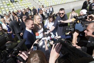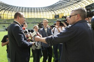 Pierwszy w historii ślub na stadionie PGE Arenie w Gdańsku Letnicy. Związek małżeński zawarli Inga Szwarc i Konrad Dmoch w obecności Prezydenta Gdańska Pawła Adamowicza (nz udziela wypowiedzi dla prasy)