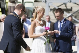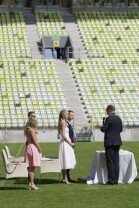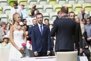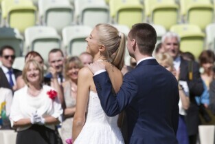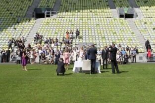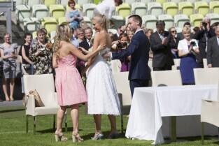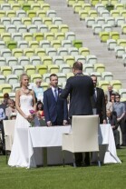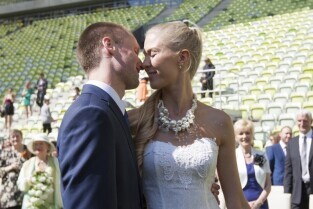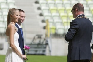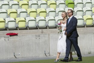 Pierwszy w historii ślub na stadionie PGE Arenie w Gdańsku Letnicy. Związek małżeński zawarli Inga Szwarc (nz z ojcem) i Konrad Dmoch w obecności Prezydenta Gdańska Pawła Adamowicza