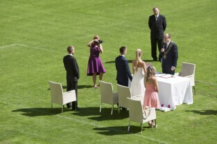 Pierwszy w historii ślub na stadionie PGE Arenie w Gdańsku Letnicy. Związek małżeński zawarli Inga Szwarc i Konrad Dmoch w obecności Prezydenta Gdańska Pawła Adamowicza. Nz. Z-ca Kierownika Urzędu Stanu Cywilnego w Gdańsku Grzegorz Graefling