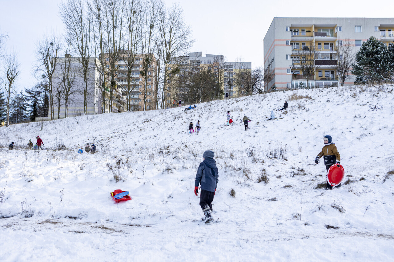 Gdańsk. Po obwitych nocnych opadach śniegu dzieci jeżdżą na sankach w dzielnicy Piecki-Migowo.