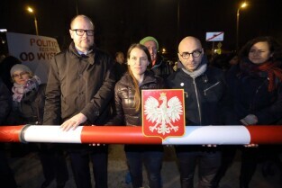 Gdańsk. Około 200 osób w tym politycy opozycji, demonstrowało przed Muzeum II Wojny Światowej w Gdańsku. Nz. Prezydent Gdańska Paweł Adamowicz, Posłanka Agnieszka Pomaska, Radomir Szumełda z KOD i Ewa Lider-Nowoczesna.