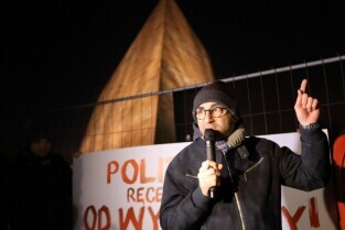 Gdańsk. Około 200 osób w tym politycy opozycji, demonstrowało przed Muzeum II Wojny Światowej w Gdańsku. Nz. Jacek Karnowski-Prezydent Sopotu.