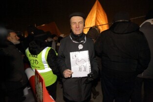 Gdańsk. Około 200 osób w tym politycy opozycji, demonstrowało przed Muzeum II Wojny Światowej w Gdańsku. Nz. Prezydent Gdańska Paweł Adamowicz.