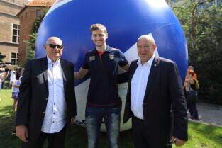 Gdańsk. Piknik siatkarski przed mistrzostwami Europy w siatkówce mężczyzn Eurovolley Poland 2017. Nz. Nz.. Dyrektor Biura Prezydenta Gdańska ds. Sportu Andrzej Trojanowski, Zawodnik Lotosu Trefl Piotr Nowakowski i Prezes PZPS Jack Kasprzyk.