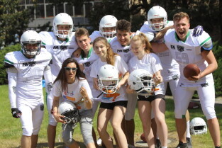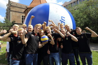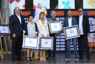 Gdańsk. Piknik siatkarski przed mistrzostwami Europy w siatkówce mężczyzn Eurovolley Poland 2017. Nz. Prezes PZPS Jack Kasprzyk, Ambasadorzy Mistrzostw: Dorota Kolak, Sylwia Gruchała, Mirosław Baka i Piotr Gacek i Dyrektor Biura Prezydenta Gdańska ds. Sportu Andrzej Trojanowski.