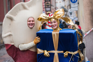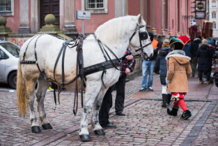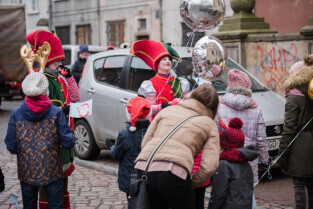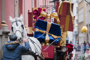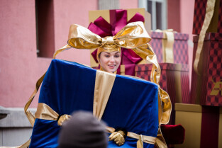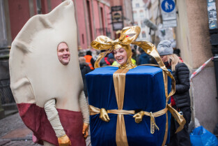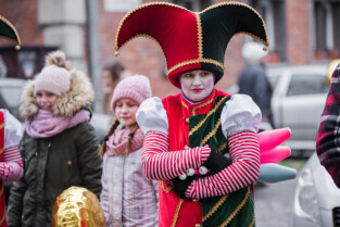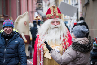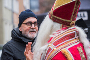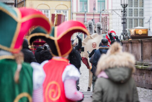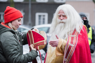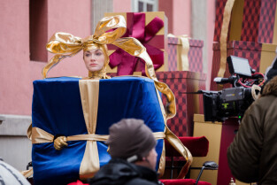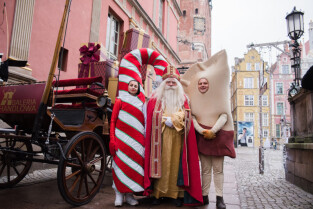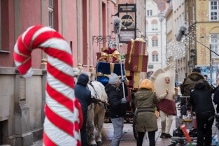 Gdańsk, ul. Ławnicza. Plan zdjęciowy filmu "Miłość jest wszystkim". Nz. Olaf Lubaszenko w roli Świętego Mikołaja