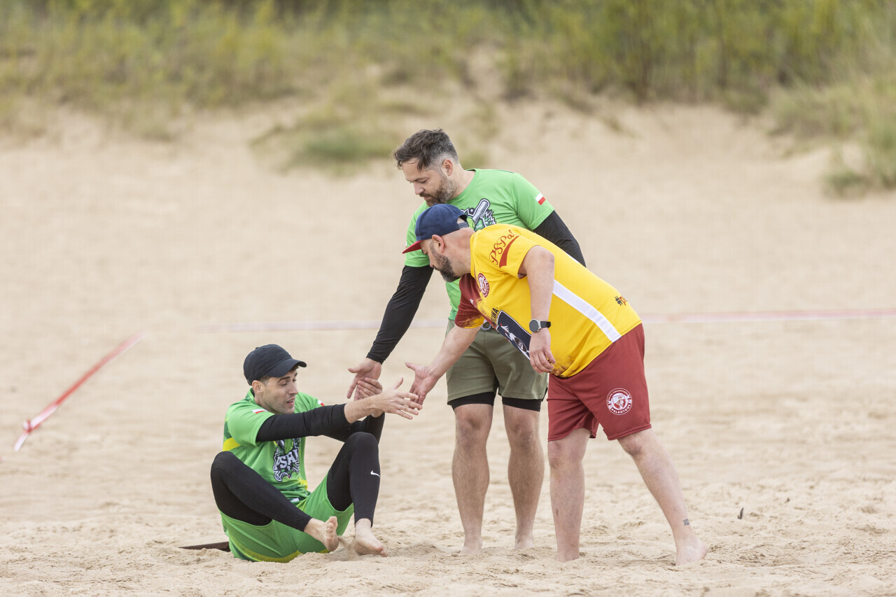 Gdańsk. Mimo deszczowej pogody na plaży na Stogach odbył się Plażowy Puchar Polski w Palanta, w którym udział wzięło 11 drużyn z całej Polski