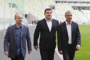 Wizyta podkomisji sejmowej ds. organizacji Euro 2012 na gdańskim stadionie PGE Arena. Nz. od lewej: poseł Paweł Orłowski, przewodniczący komisji Andrzej Biernat, Z-ca Prezydenta Gdańska Maciej Lisicki