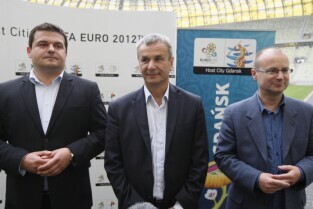 Wizyta podkomisji sejmowej ds. organizacji Euro 2012 na gdańskim stadionie PGE Arena. Nz. od lewej: Z-ca Prezydenta Gdańska Maciej Lisicki, poseł Paweł Orłowski, przewodniczący komisji Andrzej Biernat
