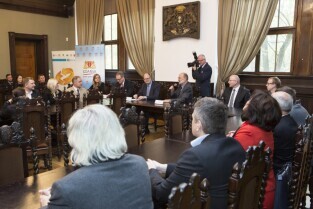 Politechnika Gdańska. Podpisanie Memorandum dla Projektu ACCUS pomiędzy miastem Gdańsk, Politechniką Gdańską, spółką InnoBaltica i Fundacją Interizon. Nz. Prezes InnoBaltica Sp. z o.o. Jarosław Pawłowski (po lewej) i Prezydent Gdańska Paweł Adamowicz