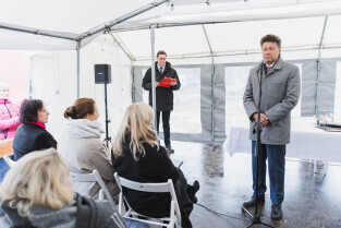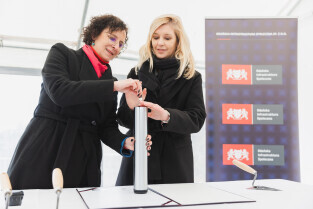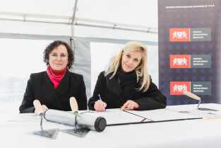 Gdańsk, ul. Ogińskiego. Podpisanie i wmurowanie aktu erekcyjnego pod budowę pięciu budynków: czterech mieszkalnych i jednego na cele społeczne. Nz. (od lewej) Aleksandra Krzywosz, prezes Gdańskiej Infrastruktury Społecznej Sp. z o.o. i Emilia Lodzińska, zastępczyni prezydenta Gdańska ds. rozwoju przestrzennego i mieszkalnictwa