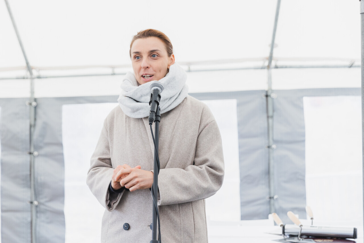 Gdańsk, ul. Ogińskiego. Podpisanie i wmurowanie aktu erekcyjnego pod budowę pięciu budynków: czterech mieszkalnych i jednego na cele społeczne. Nz. Monika Chabior, zastępczyni prezydenta Gdańska ds. rozwoju społecznego i równego traktowania