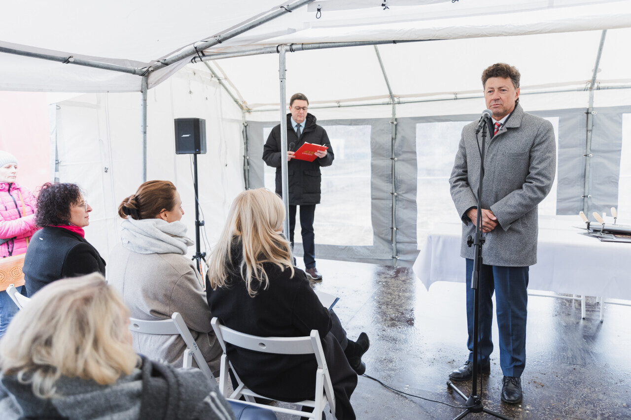 Gdańsk, ul. Ogińskiego. Podpisanie i wmurowanie aktu erekcyjnego pod budowę pięciu budynków: czterech mieszkalnych i jednego na cele społeczne. Nz. Tomasz Balcerowski, prezes Firmy Budowlanej Ekoinbud Sp. z o.o. z Gdańska