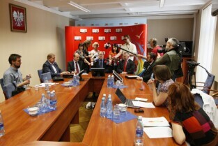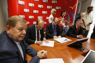 Urząd Miejski w Gdańsku. Podpisanie umowy na dofinansowanie Trasy Sucharskiego pomiędzy Miastem Gdańsk, a Centrum Unijnych Projektów Transportowych. Nz. od lewej: Dyrektor Centrum Unijnych Projektów Transportowych Paweł Szaciłło, Prezydent Gdańska Paweł Adamowicz, Z-ca Prezydenta Gdańska Andrzej Bojanowski, Dyrektor Wydziału Programów Rozwojowych UMG Marcin Dawidowski