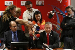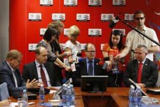 Urząd Miejski w Gdańsku. Podpisanie umowy na dofinansowanie Trasy Sucharskiego pomiędzy Miastem Gdańsk, a Centrum Unijnych Projektów Transportowych. Nz. od lewej: Prezes Gdańskich Inwestycji Komunalnych Ryszard Trykosko, Dyrektor Centrum Unijnych Projektów Transportowych Paweł Szaciłło