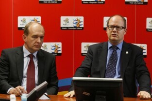 Urząd Miejski w Gdańsku. Podpisanie umowy na dofinansowanie Trasy Sucharskiego pomiędzy Miastem Gdańsk, a Centrum Unijnych Projektów Transportowych. Nz. od lewej: Dyrektor Centrum Unijnych Projektów Transportowych Paweł Szaciłło, Prezydent Gdańska Paweł Adamowicz