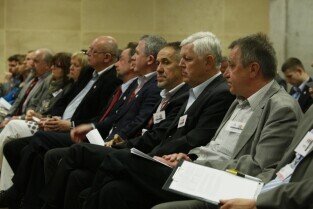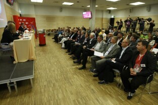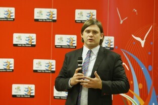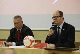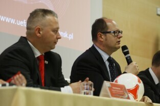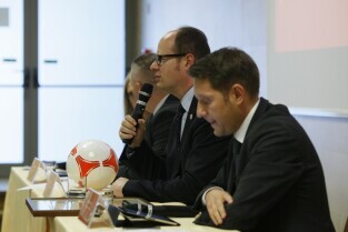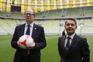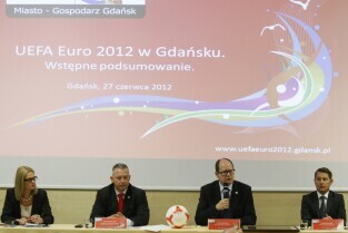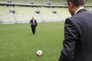 Gdańsk, stadion piłkarski na Letnicy. Konferencja prasowa podsumowująca gdańską część organizacji mistrzostw piłkarskich UEFA Euro 2012. Po briefingu jego uczestnicy mieli możliwość zagrać w piłkę na murawie stadionu