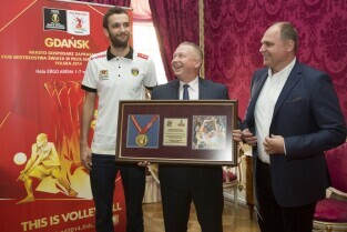 Podsumowanie Mistrzostw Świata w Piłce Siatkowej Mężczyzn - konferencja prasowa. Gdańsk, Dom Uphagena. Nz. Reprezentant Polski w Piłce Siatkowej Mężczyzn Mateusz Mika i Wiceprezes Polskiego Związku Piłki Siatkowej Artur Popko wręczają podziękowanie za współorganizację mistrzostw, które odbiera Z-ca Prezydenta Gdańska Andrzej Bojanowski