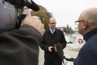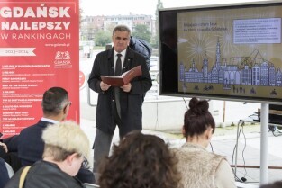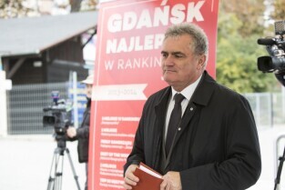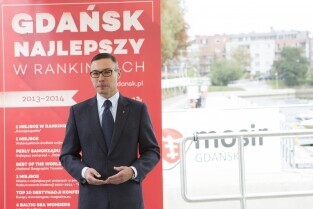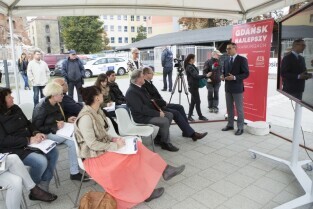 Gdańsk, przystań Żabi Kruk. Konferencja prasowa poświęcona podsumowaniu kadencji 2010-2014 władz Gdańska