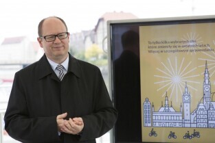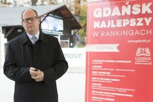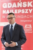 Gdańsk, przystań Żabi Kruk. Konferencja prasowa poświęcona podsumowaniu kadencji 2010-2014 władz Gdańska. Nz. Prezydent Gdańska Paweł Adamowicz