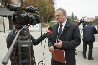 Gdańsk, przystań Żabi Kruk. Konferencja prasowa poświęcona podsumowaniu kadencji 2010-2014 władz Gdańska. Nz. Przewodniczący Rady Miasta Gdańska Bogdan Oleszek