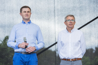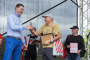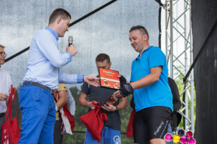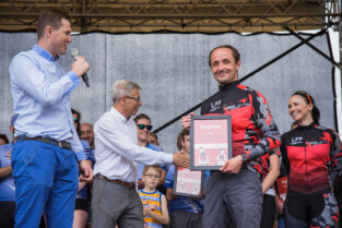 Gdańsk. Park im. Ronalda Reagana. Podsumowanie kampanii "Kręć kilometry dla Gdańska - European Cycling Challenge". Nz. Piotr Grzelak Z-ca Prezydenta ds. polityki komunalnej i Radny Andrzej Kowalczys