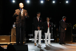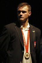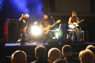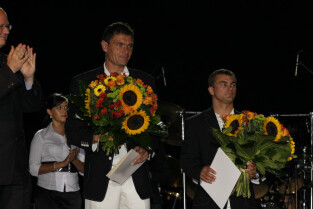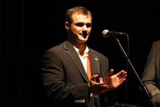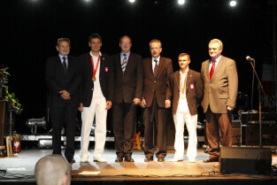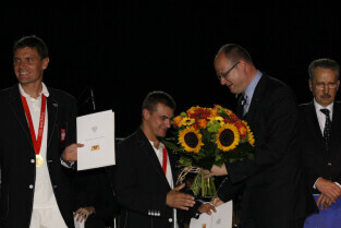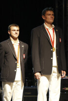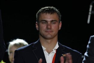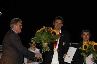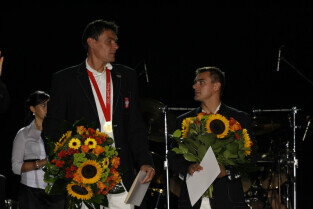 Władze Gdańska nagrodziły nagrodami pieniężnymi Adama Korola i Leszka Blanika - złotych medalistów igrzysk w Pekinie. Gdańsk, Hala AWFiS. Uroczystość zakończyła się koncertem zespołu IRA.